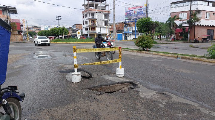 Tarapoto. Un hundimiento en la cuadra 16 del jirón Alfonso Ugarte, cerca del óvalo, está generando un riesgo constante para los conductores que transitan por esta concurrida vía. A pesar de la presencia de una cinta de seguridad colocada para advertir sobre el peligro, los conductores de vehículos menores y mayores enfrentan dificultades debido al deterioro del pavimento.