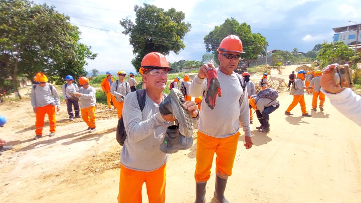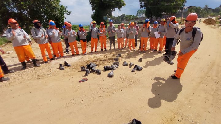 Esta tarde un grupo de trabajadores de construcción civil que ejecutan la obra de mejoramiento de la infraestructura vial urbana de la asociación de vivienda Cerro Escalera en el distrito de la Banda de Shilcayo, realizó una media de protesta lanzando sus zapatos viejos y desuso que el Consorcio Las Praderas entregaron EPT. Elementos de protección para el trabajador, completamente inoperativos, y así tienen que trabajar arriesgando sus vidas de cada obrero.