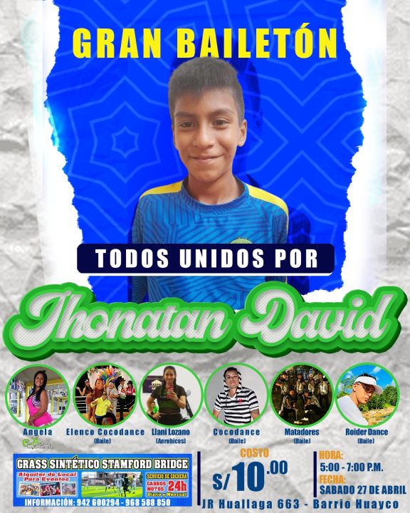 Jorge Luis Castro Linares, conocido en el mundo artístico como “Coco Dance” se identificó con el caso porque tuvo una experiencia casi igual y viendo la necesidad de la familia, ahora viene organizando una actividad pro salud que se trata de un Gran Bailetón a favor de Jhonatan David, menor de 9 años que se encuentra internado en el hospital minsa de Tarapoto, luego que fue víctima de un accidente de tránsito el último fin de semana, junto a sus padres, quienes no tuvieron la misma suerte y murieron.