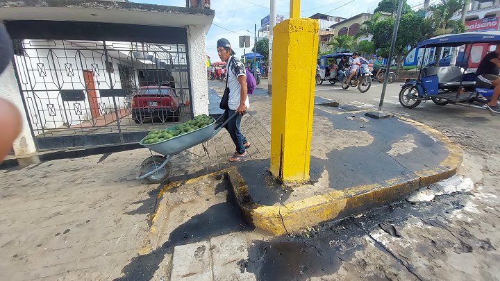 Un vecino del barrio Comercio de Tarapoto arrojó aceite quemado en toda la vereda y las cunetas de la intersección de los jirones Tahuantinsuyo y Sucre, con el aparente propósito de impedir la presencia de vendedores ambulantes en la zona.