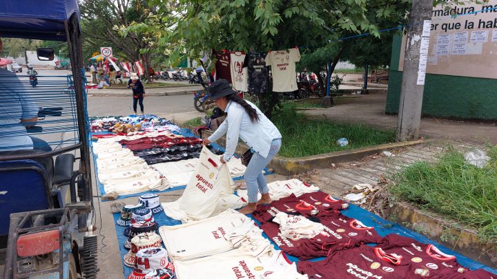 A pocas horas del partido de Universitario de Deporte y Unión Comercio los comerciantes de diferentes partes del país llegaron a Tarapoto para expender las camisetas, gorros y banderolas del equipo crema, como de costumbre se posesionaron a inmediaciones del estadio Carlos Vidaurre García de nuestra ciudad, donde mañana será el partido de la liga uno.